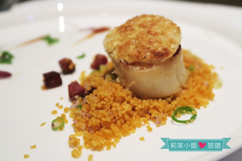 香煎至八分熟的干貝,搭配一旁的辣培根北非小米入口,一點都不會有違和感,是我很喜歡的前菜。