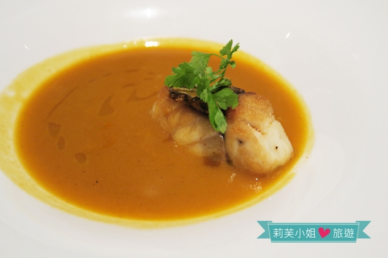 餐前麵包提供的是小圓法國麵包和松子麵包,搭配總統牌的鹹奶油。一改歐式麵包偏硬的口感,這邊的麵包則是偏Q彈,讓愛吃歐式麵包的我愛不釋手,一度還想多點一份。