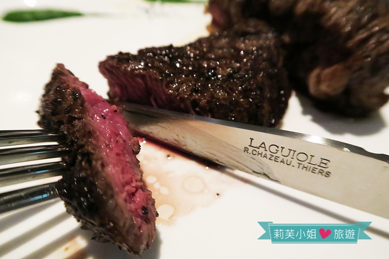 剛上桌以為色澤偏深咖啡色,很擔心牛肉過熟,想不到切開後完美地呈現五分熟的粉紅色澤。由於老饕牛排已經事先調味,加上我們飲食偏清淡,喜歡能品嚐細緻肉質的鮮甜與滑嫩,口齒留香。
