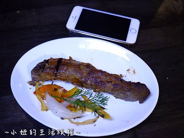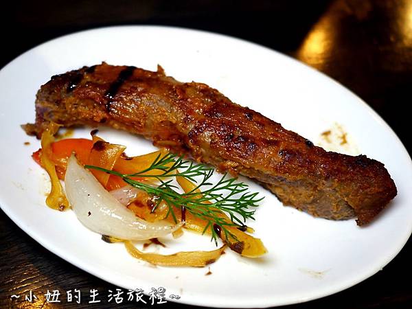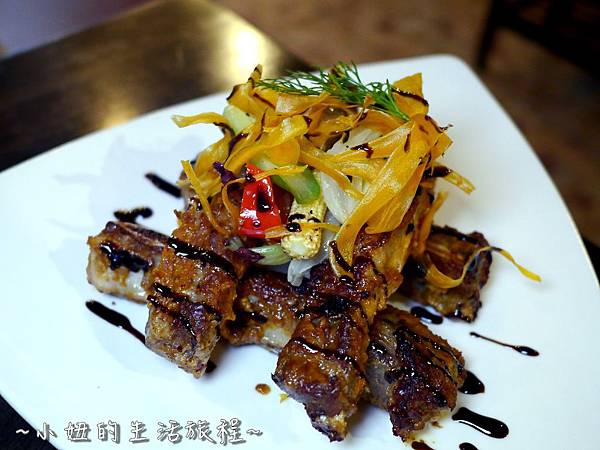 肋排表皮刷上蒜泥與宜蘭三星蔥泥,加上自製天然的調味醬,吃起來又香又微辣,沒有過多的調味,吃得到豬肋排原始的豬肉香氣,肉質鮮嫩多汁,跟外頭味道偏甜、偏乾的烤豬肋排很不一樣,搭配的烤蔬菜也很棒,淋上巴薩米克醋更爽口美味