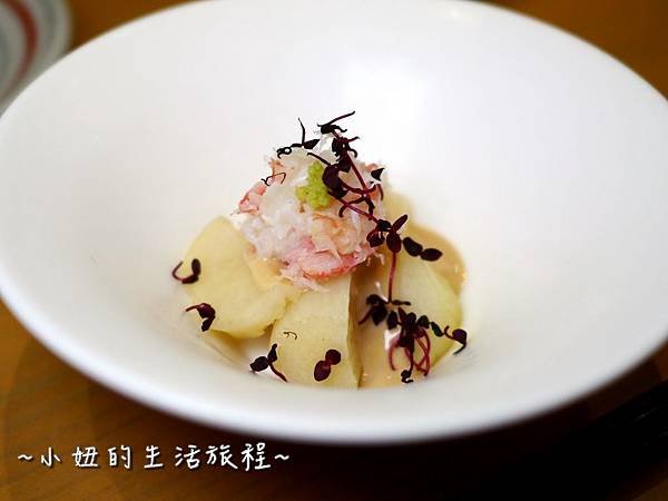 前菜,美人腿、松葉蟹和紅芽佐胡麻醬,上面用一些山葵末點綴,吃起來相當清爽開胃
