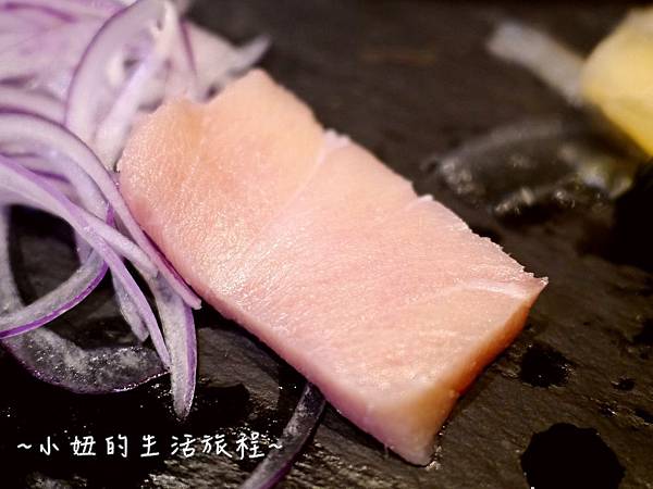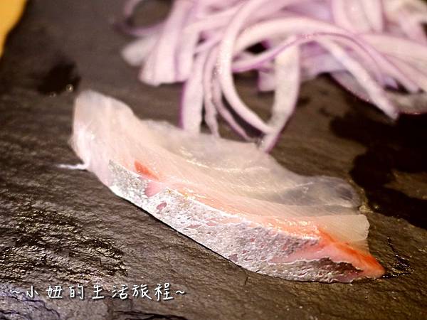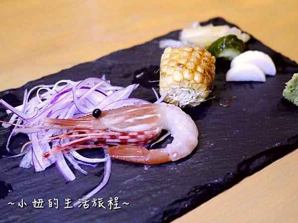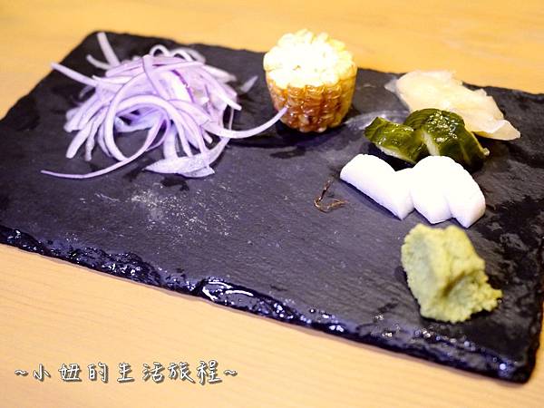這裡的生魚片是用石板呈現料理給客人,芥茉是用阿里山的現磨山葵,不是化學的,上頭的甘蔗玉米吃起來非常香甜,一旁的醬菜也非常美味,尤其是小黃瓜的刀工了得,妞媽一下子就吃光