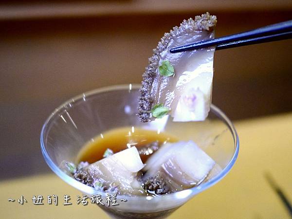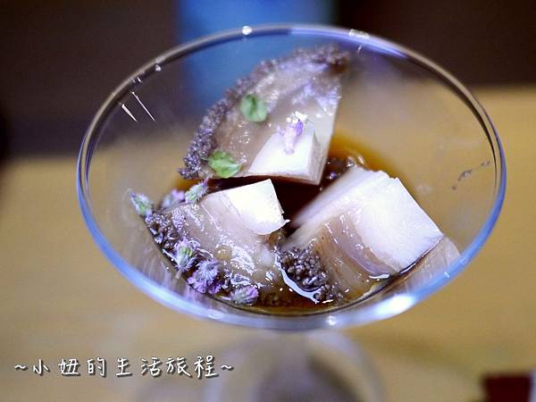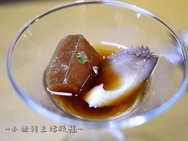 南非鮑魚,鮑魚與滷得透徹的蘿蔔,裝在玻璃杯看起來很優雅,鮑魚口感Q彈又入味,上面撒上些許紫蘇花,讓味道更加有層次