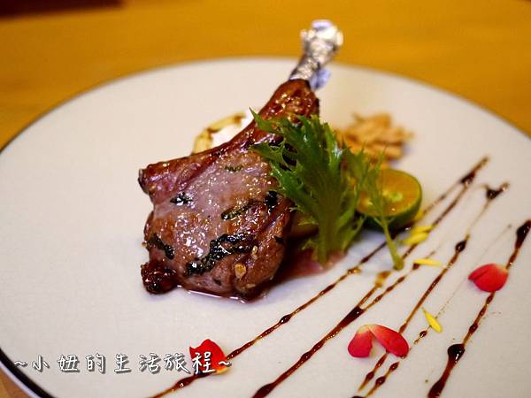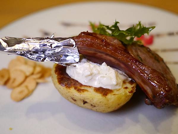 小羊排可以直接拿起來咬,尾端貼心包上鋁箔紙,肉質軟嫩多汁、帶點淡淡的紫蘇味