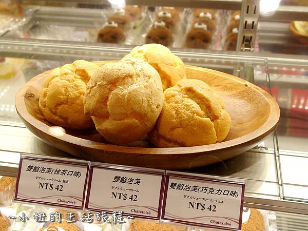 莎得來茲(Chateraise)在結帳櫃台旁有告示牌強調產品都是日本直輸入的,它是日本山梨縣甲府市的綜合西點廠商,目前只有三家分店,另兩家在台北車站的微風廣場和微風南京,它們家最厲害的是雙餡泡芙,雙餡泡芙有3種口味,分別式抹茶+北海道鮮乳、卡士達+北海道鮮乳,和巧克力+北海道鮮乳,妞媽挑了抹茶口味