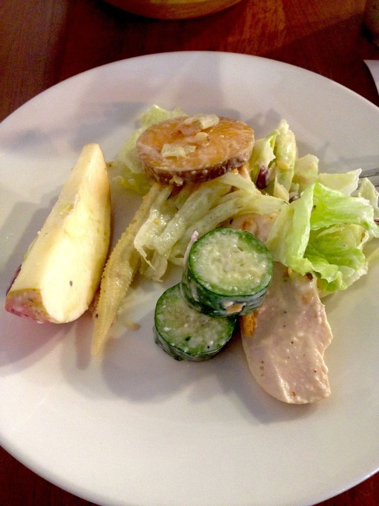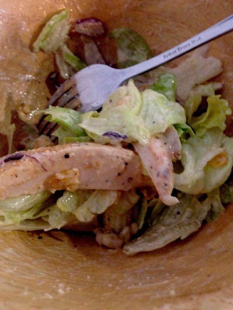 沙拉一上來我們就傻眼了,超大一盆。我男人已經開始用眼神青我,要唸我又瞎眼饞點太多。 可以看到雞柳超級大一條的!還有好幾條⋯ 生菜內夾有玉米筍、南瓜、松子,醬料飽和濃郁但不油膩,是完美的比例。