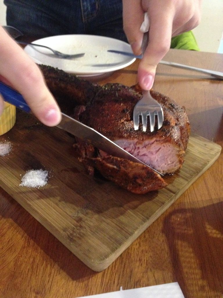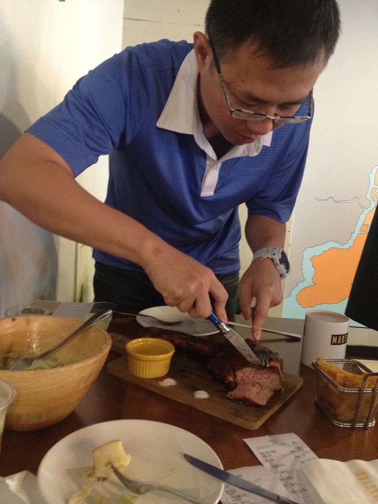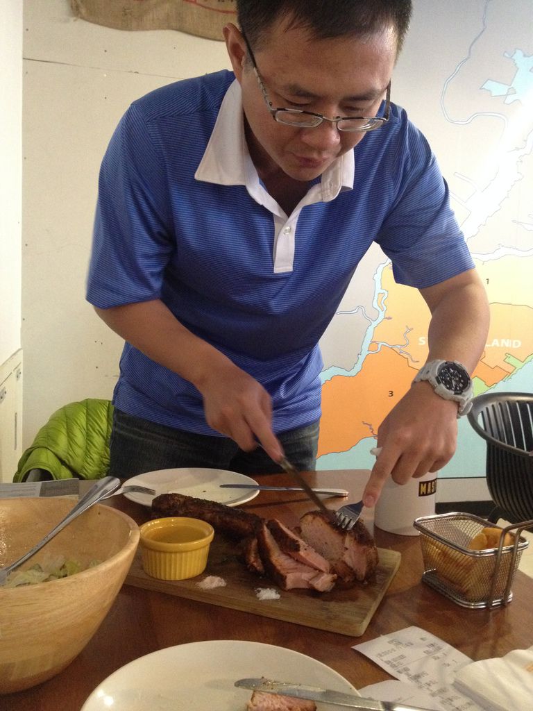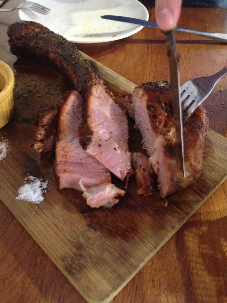戰斧豬排店家建議七分熟,肉質軟嫩又保有肉汁。 肉食恐龍開始以庖丁解牛之姿片肉(這人吃沙拉的時候一臉臭臉,看到肉就笑了= = ),斷面秀好精彩,中心透露著粉嫩,外皮熟度高卻一點也不柴。