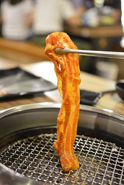 韓式辣味豬五花,一整片豬五花烤好後,再用剪刀分食,跟吃韓國烤肉是一樣的做法