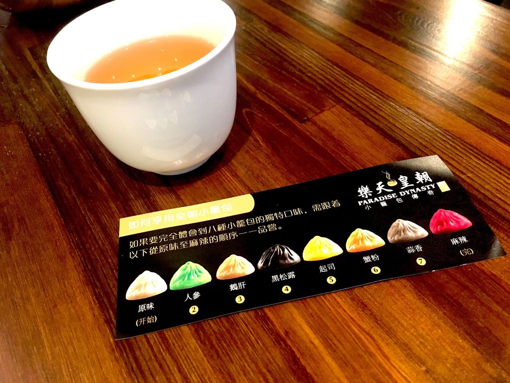 首先樂天皇朝聲明小龍包的顏色都取自天然食材,食材都在這個小板子上,所以大家可以安心享用。 因為八色口味不同、有輕有重,上菜時服務生會建議吃的順序,以免後面味道比較重的搶戲,但我覺得喝個茶就可以了---因為我第一顆就是想吃松露阿! 前幾天才在跟朋友討論松露到底是甚麼味道,吃完支後我也描述不出來,大概可以理解他的特色與魅力。