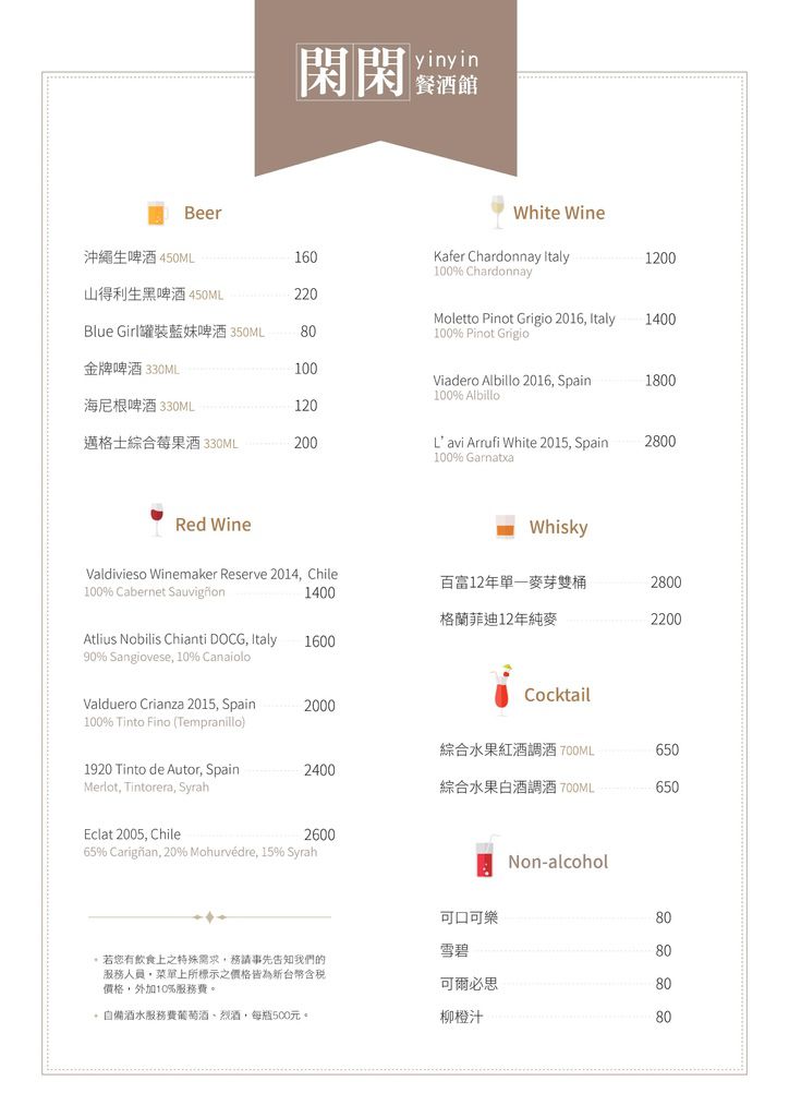在閑閑除了招牌的啤酒之外,也有販售許多款紅白酒,價格CP值都相當不錯。