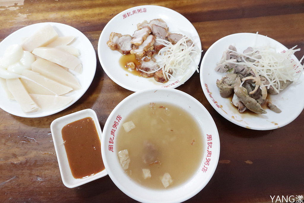 剝皮寮老街對面的周記肉粥已有60年以上歷史,是在地知名老店,用餐時間總是大排長龍。雖然服務態度不佳,甚至店員彼此都經常在營業時吵架,常客對此也似乎習以為常,好滋味及低廉價格仍舊吸引眾多前來用餐的客人。用餐方式是自己拿著菜單先找空位,想吃的小菜畫記,並寫上用餐人數及桌號,拿到入口處點菜。小菜是以人數計量計價,也就是說如果沒有特別要求,兩人用餐就會畫記的小菜都給兩人份,小菜上桌後才會有人來問要幾碗粥。會吵架的原因大多是初訪客人對於上粥方式有意見,或是上粥的員工亂上一通。若要在此用餐,切記要心平氣和。