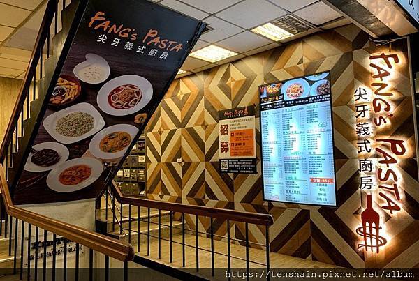 「尖牙義式廚房Fang's Pasta 」台北南京店在台北市南京東路五段6號2F,在一樓的牆上就有詳細的菜單可供參考。