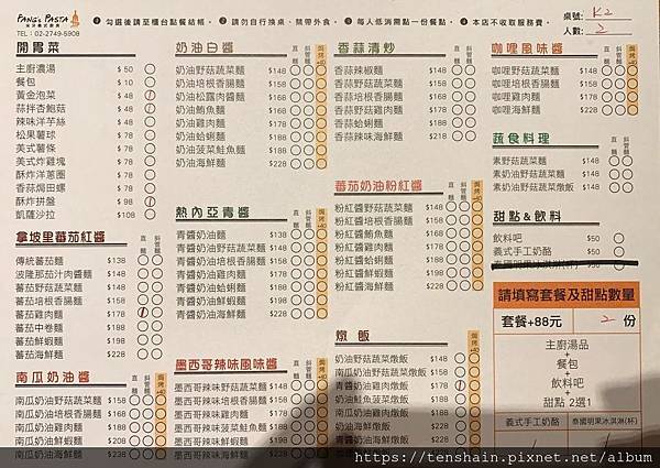 「尖牙義式廚房Fang's Pasta 」基本上是自助式的餐廳,不收服務費(這真是小資一族的福音啊!)。服務人員帶你入座後,會給你一張點菜單,如下圖。