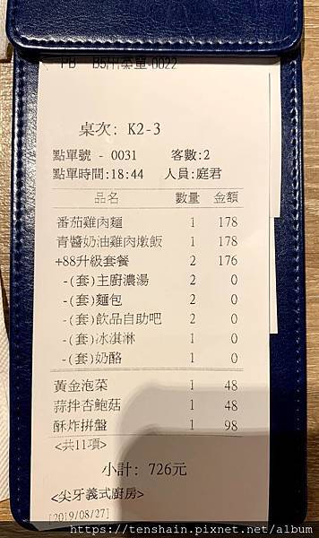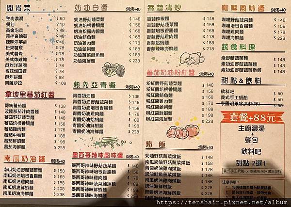 老婆勾選好點菜單後,接下來的工作就是我的責任了。拿著點菜單,來到櫃台點餐,我們今天點的主餐是青醬奶油雞肉燉飯和蕃茄雞肉麵,麵條都是直麵。兩者都加價88元,升級為套餐,然後再加點一些小菜和炸物。