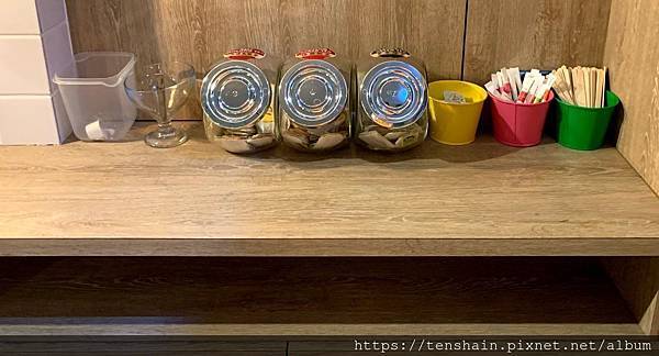 飲料機左側矮櫃上有攪拌棒、糖包、鮮奶球,還有茶包。