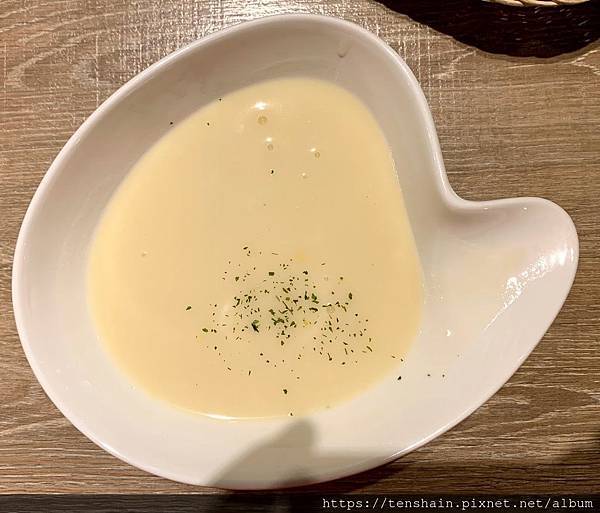 上完廁所,第一道主廚濃湯上桌啦。玉米濃湯分量十足,味道很香醇濃郁,裡面有大量顆粒飽滿的玉米粒。熱度相當的夠,但不會燙口,喝起來很暖胃。