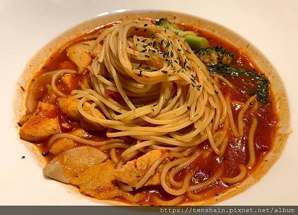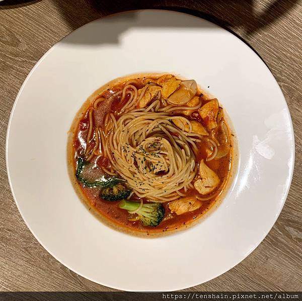 這是蕃茄雞肉麵,簡簡單單的麵條、雞肉、青花菜和蕃茄醬汁。