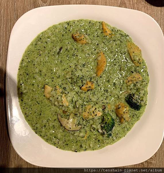 青醬奶油雞肉燉飯的米粒,硬度應該也是有經過調整,米心不會過硬,也不會軟爛。青醬和香菇的香氣超濃,燉飯的口感很滑順,溼潤度恰到好處,很好入口。分量也是很大,不怕吃不飽。