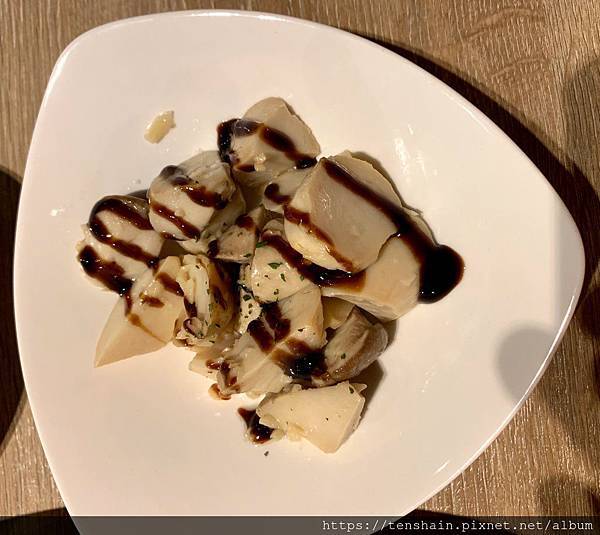蒜拌杏鮑菇不止拌了蒜,上面還淋了一些葡萄醋。這個杏鮑菇本身就料理的很有滋味,加上蒜末的嗆辣,和葡萄醋的微酸,口感也很豐富。