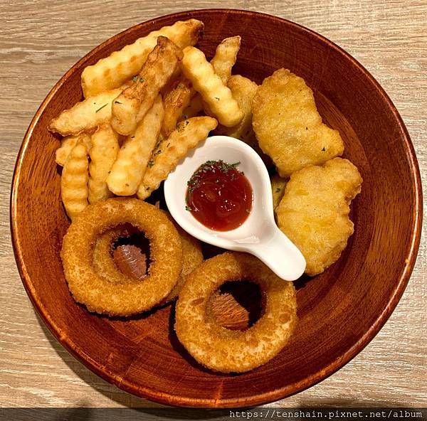 吃了這麼多,本來已經很飽了,可是看到這盤酥炸拼盤,愛吃炸物的我,瞬間就來了食慾。炸洋蔥圈和炸雞塊各四塊,都炸得又香又酥,好吃的一下就沒了!薯條則是比較鬆軟的口感,沾著蕃茄醬吃也不錯。