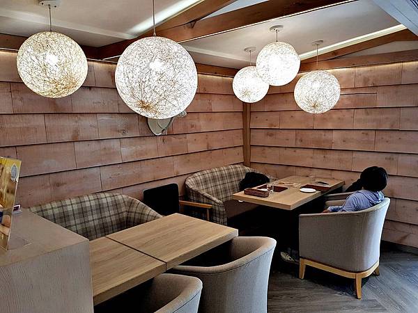 最裡面的用餐區, 吊燈美美的, 沙發用餐區搭配木質的牆壁, 有一種愜意的舒服!