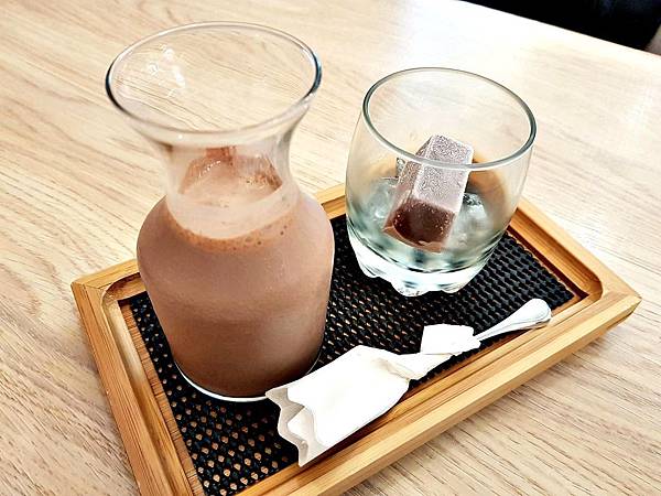 右邊的那一塊是巧克力冰磚!! 是不是很用心的餐點呢?!!! 把左邊的巧克力牛奶倒到右邊裝滿ice的杯子來喝 , 巧克力磚再溶化後, 巧克力味更加濃郁, 很棒的chocolate milk!