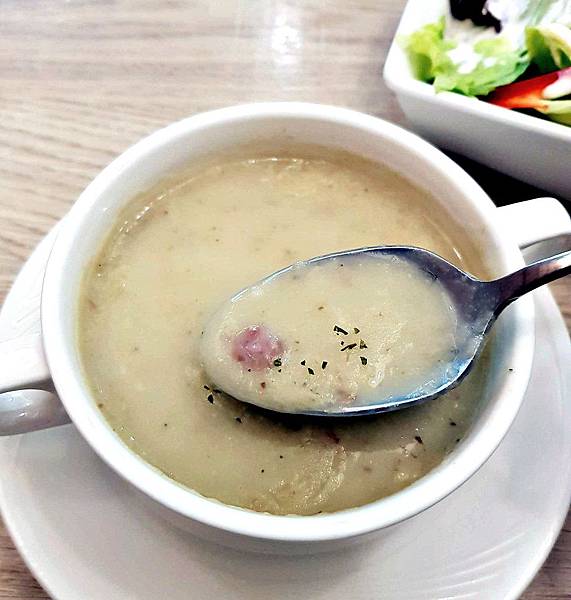 濃湯有香香奶油味兒, 還有培根碎末, 感覺還有馬鈴薯顆粒, 挺好喝的喔!