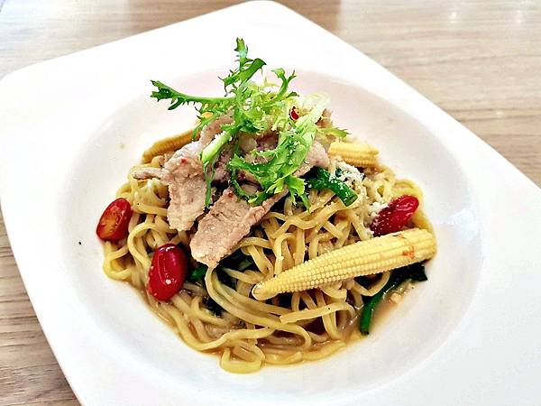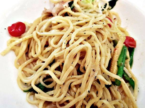 它的麵體拌有些微胡椒, 帶出胡椒香, 是偏東方口味的口感喔! 挺有特色的