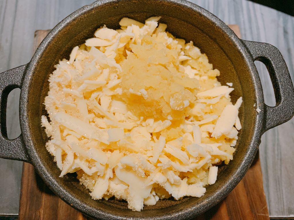 地瓜泥上灑些糖和起司,拿去烤,15分鐘後攪拌後超級好吃,不會太甜,跟妹妹一起吃光光