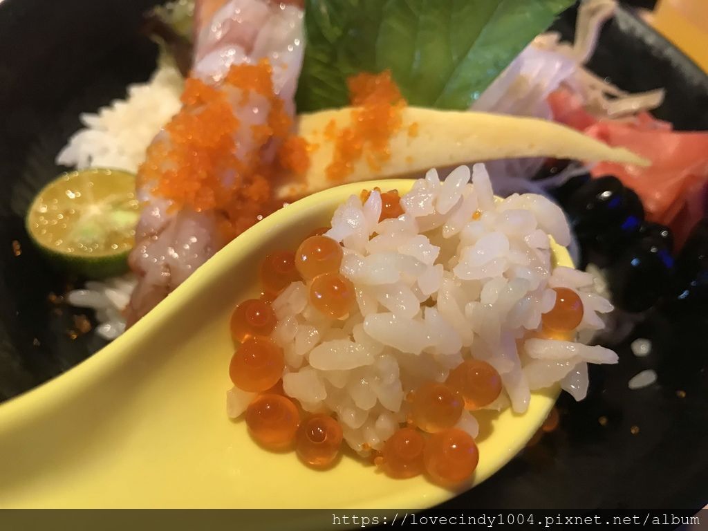 有一大隻牡丹蝦當主角,淋上鮭魚卵與蝦卵,鮭魚卵冰冰涼涼黏潤的香氣,