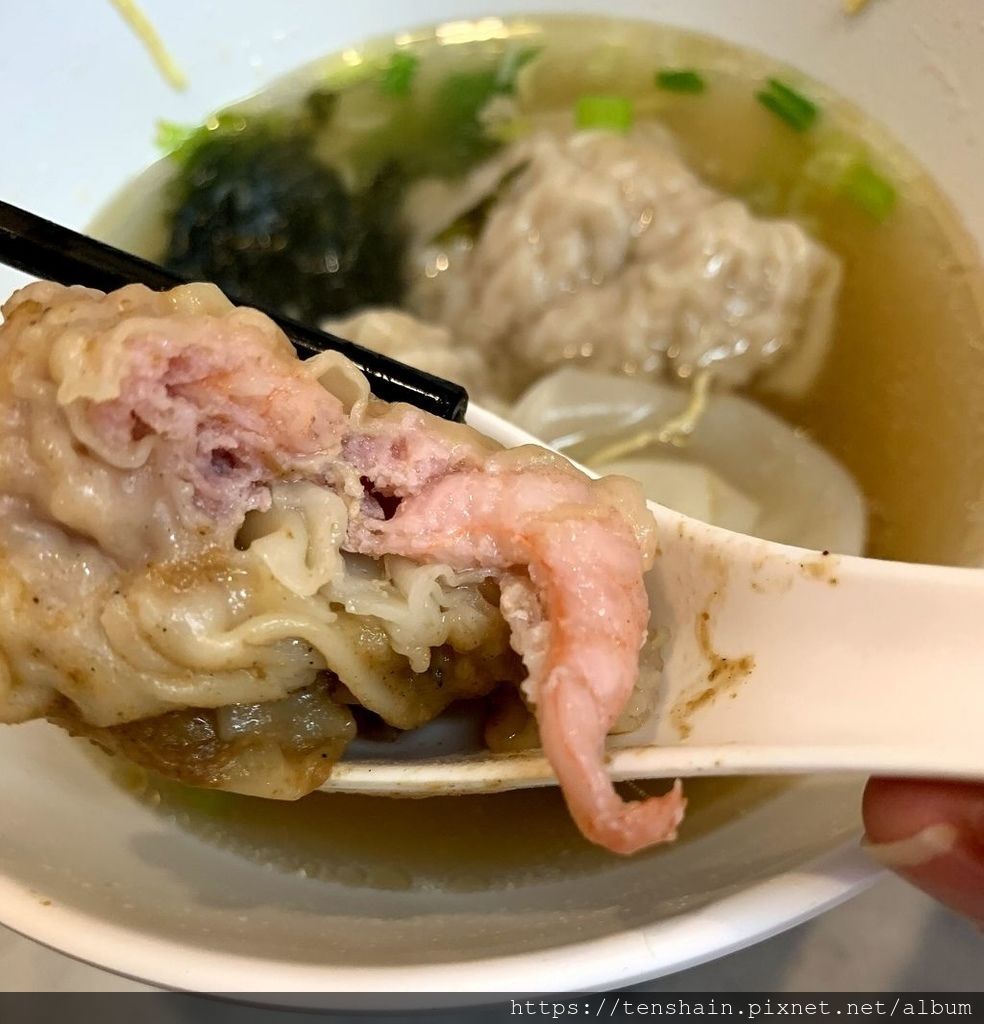 這次來吃,我發現他們的蝦肉大餛飩和以前不一樣了!以前吃蝦肉大餛飩幾乎好像在吃蝦,因為每一顆蝦肉大餛飩裡面都有兩隻又大又彈牙的新鮮大蝦,吃起來非常過癮,C/P值簡直是爆表;可是,這一次看到的蝦變小了許多,雖然還是有兩隻蝦,蝦子也還是好吃,可是那種大口吃蝦的爽度少了許多,不知道是什麼原因?也許是物價上漲了,店家又不想漲價,怕流失老顧客的無奈之舉吧?