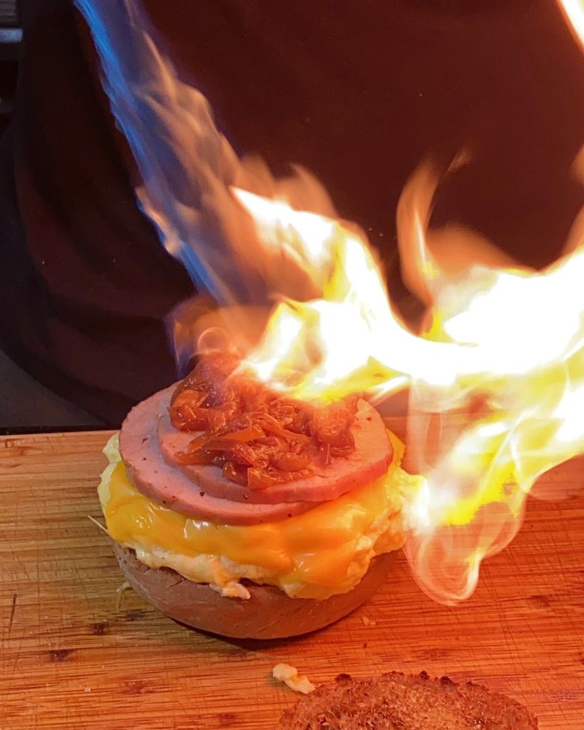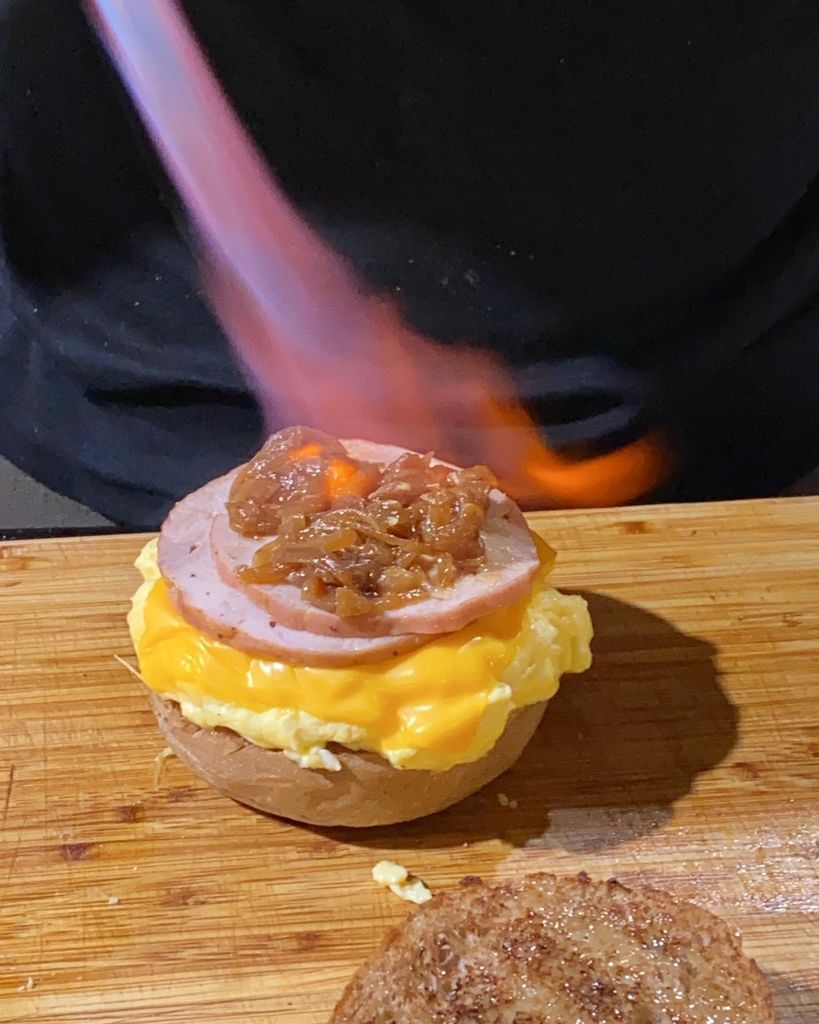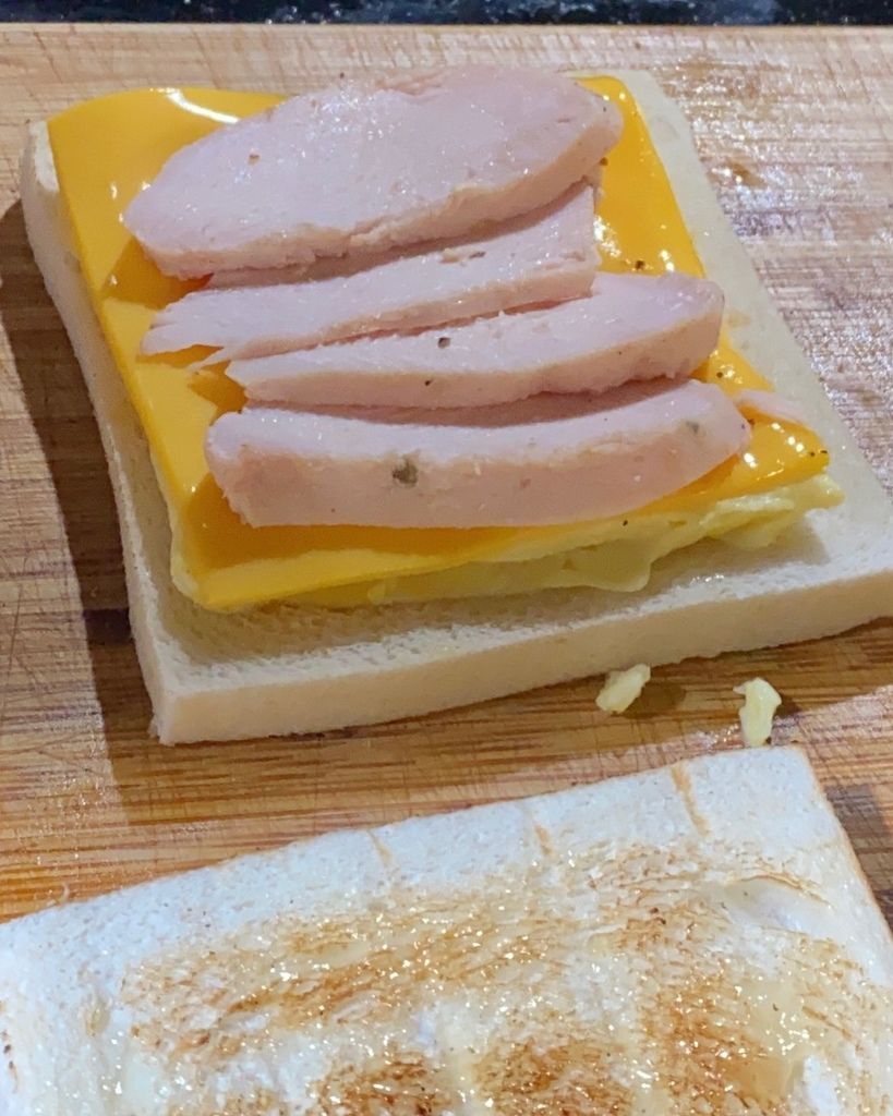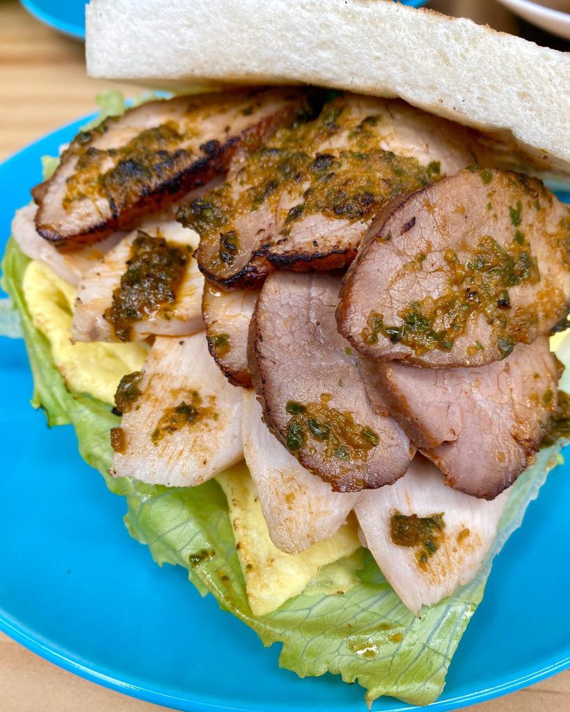 內含:吐司兩片、一種醬料、四份肉類、歐姆蛋、生菜