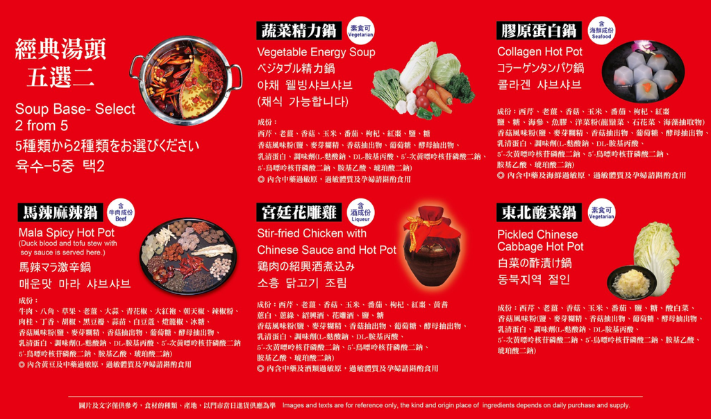 麻辣鍋、蔬菜鍋、花雕雞、膠原蛋白鍋和酸菜鍋