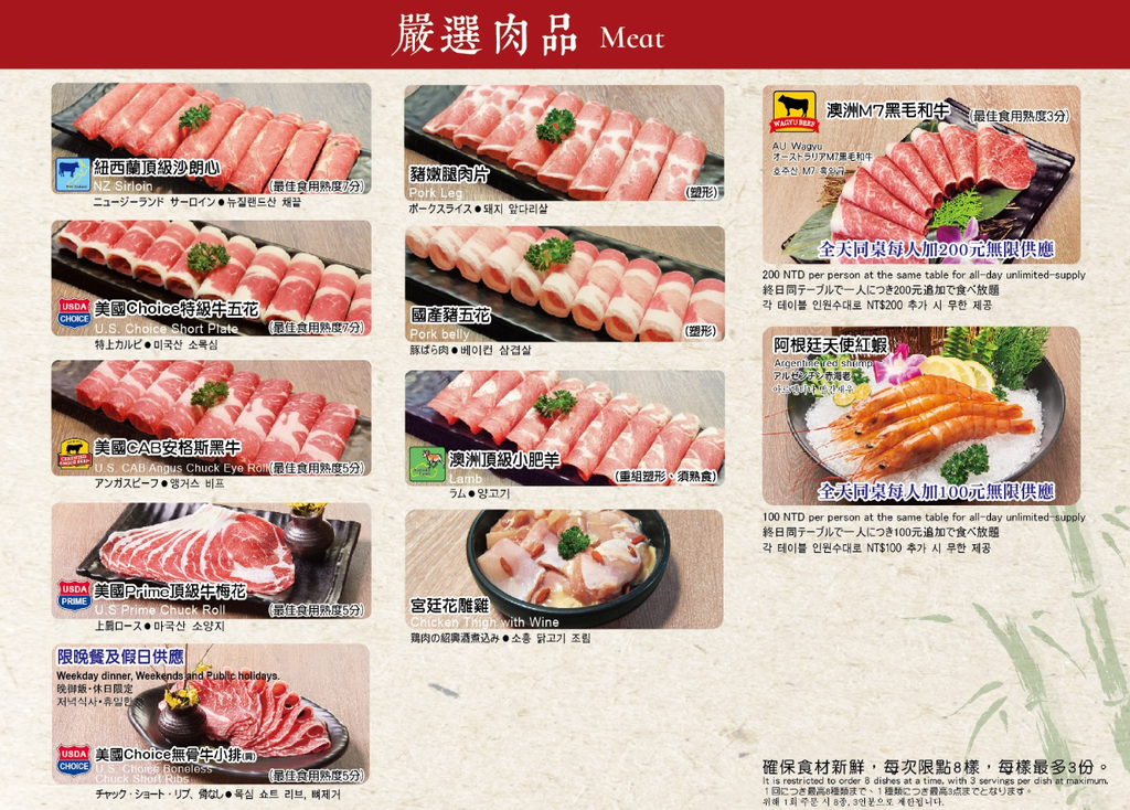 如: 阿根廷天使紅蝦、野生草蝦、澎湖明蝦、美國無骨牛小排、澳洲黑毛和牛、丹麥松阪豬等
