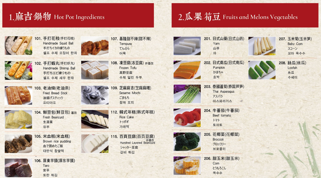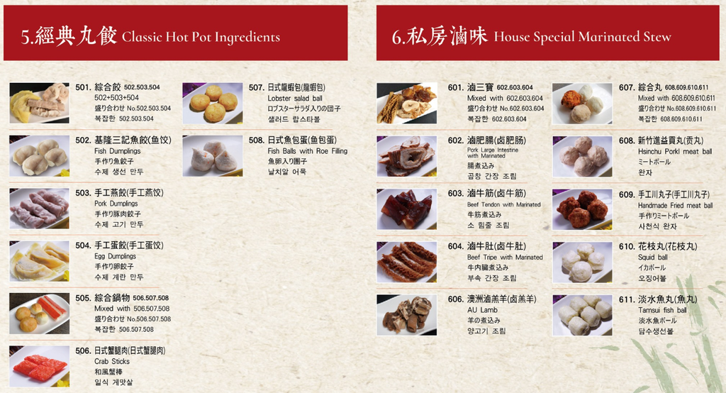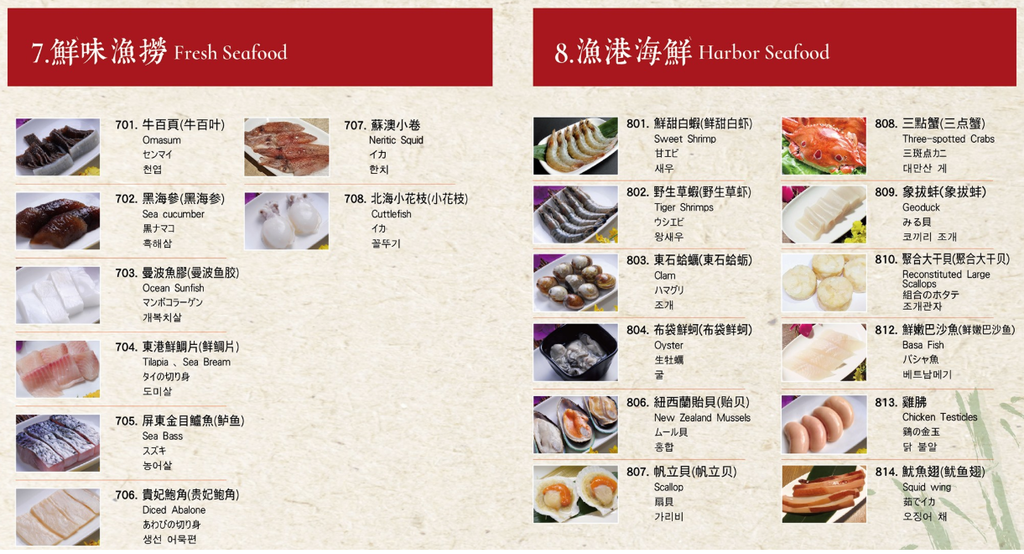 牛百頁、海參、曼波魚皮、鮮鯛片、屏東金目鱸魚、貴妃鮑角、蘇澳小卷、小花枝