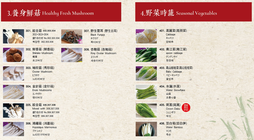 香菇、袖珍菇、鴻喜菇、杏鮑菇、金針菇、高麗菜、青江菜、水蓮、筊白筍、茼蒿等等