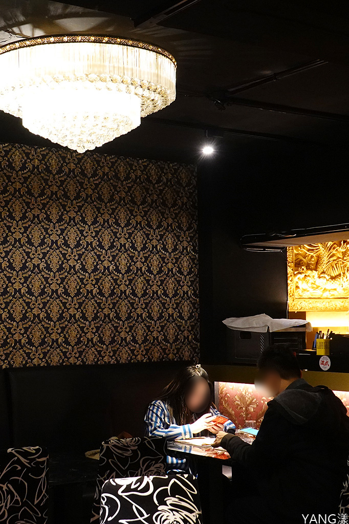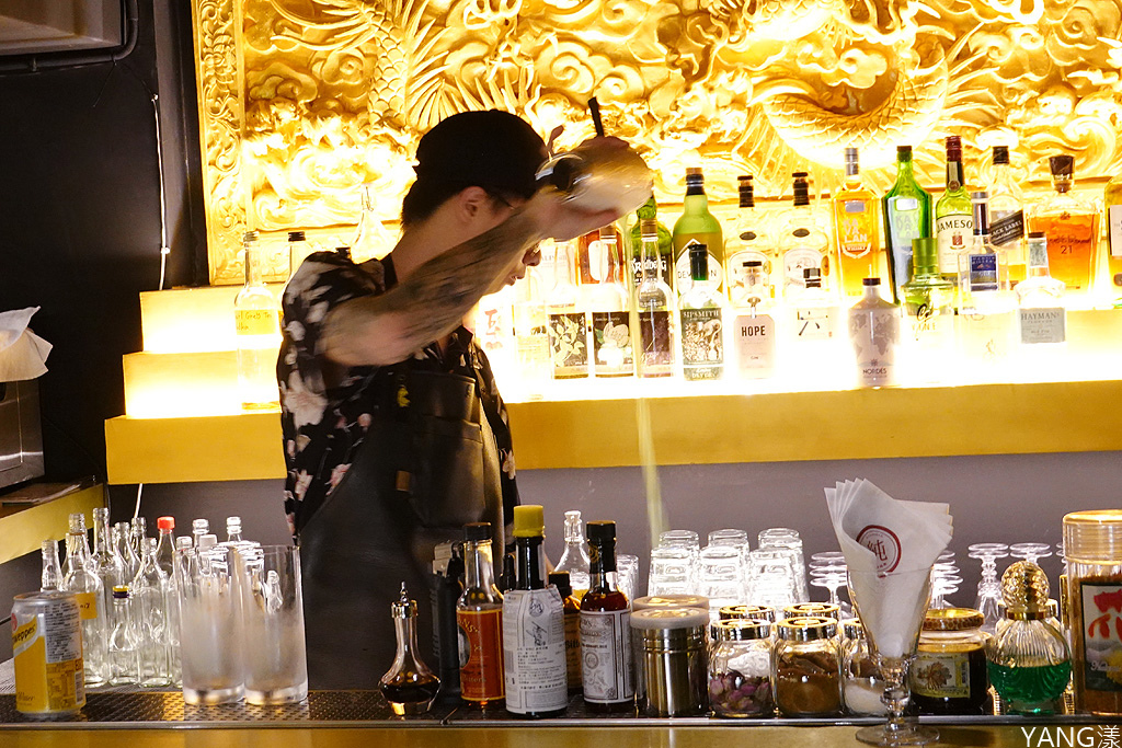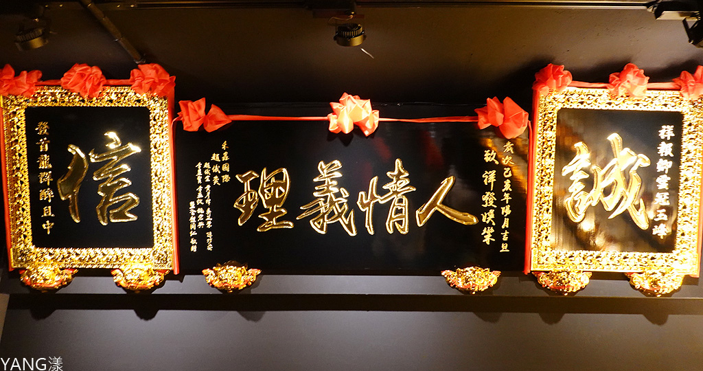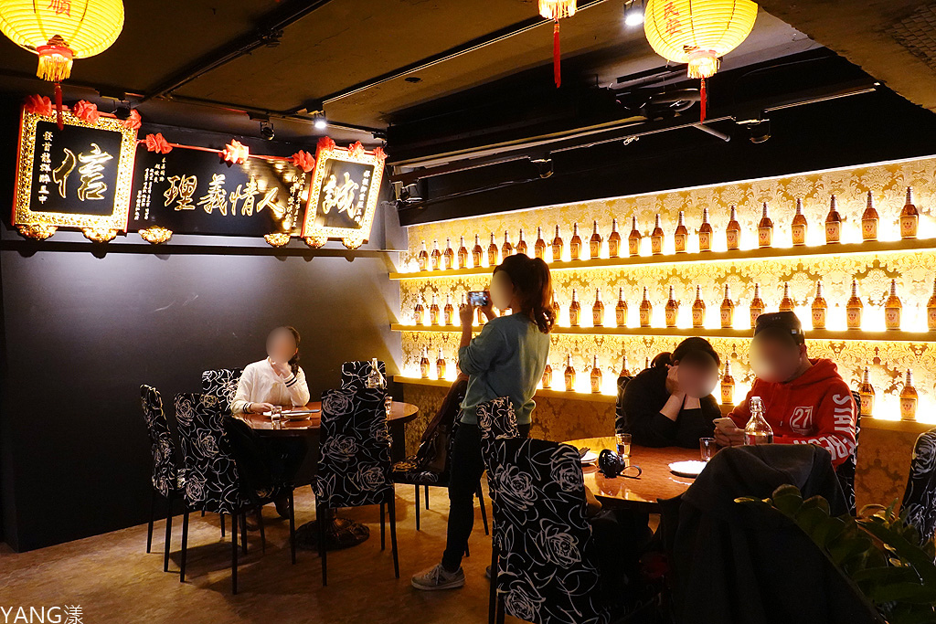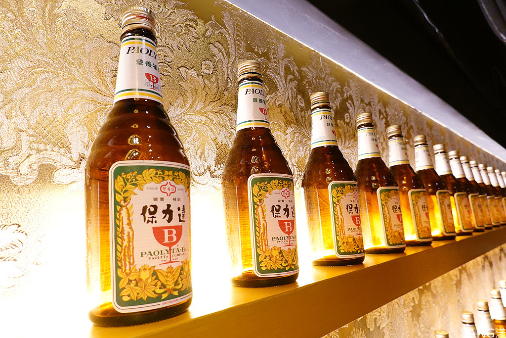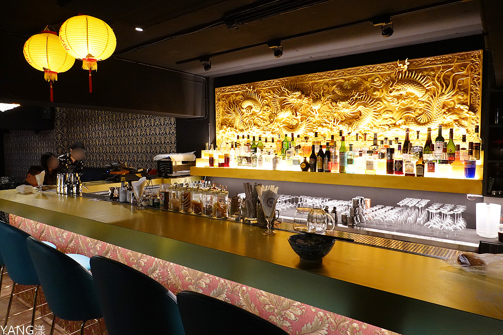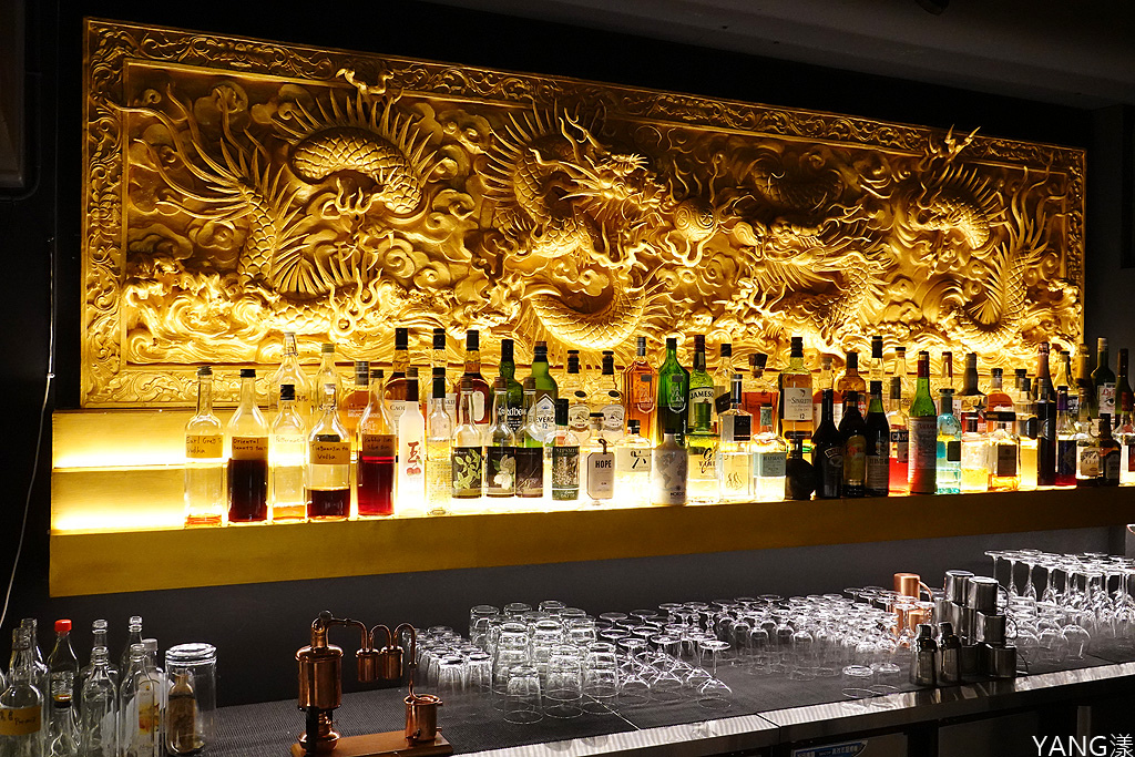 店內有近四五十個座位,從雙人方桌到圓桌都有,一個人來用餐也沒關係,可以坐在吧台區享受自己的孤獨時光,或是邊欣賞調酒師調酒,邊和他聊天。圓桌區掛著一塊「人情義理」的匾額,頗有江湖味,只要圓桌空著,不少前來用餐的客人都會在此拍照打卡。旁邊用保力達B裝飾的牆面,也是店內拍照熱區,這種帶有點台式江湖味的裝潢和另一塊有著華麗水晶燈的西式風格用餐區拼湊在一起,再加上吧台後一整面的璧霸氣十足的浮雕龍,讓店裡呈現一種頗有趣的不和諧。