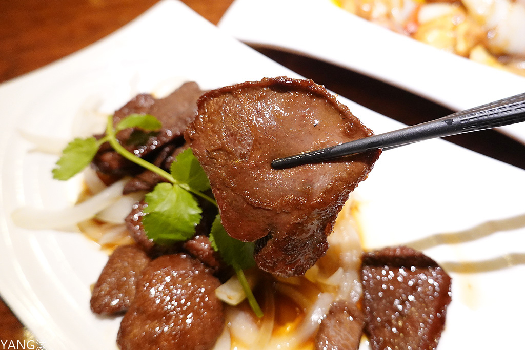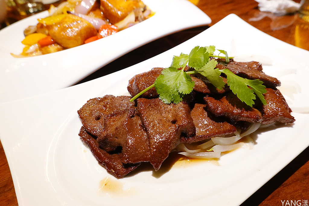因為我個人還頗愛吃豬肝,加上這道菜名有勾起我的興趣,就點了這道來試試。一般吃到的豬肝料理,要嘛是有點乾燥沒水分沒彈性,要嘛就是很Q嫩的粉肝。這道台北前三名的煎豬肝,剛端上來就香氣四溢,兩位友人都等不及,要我拍照拍快點。這道料理的特色是將厚切豬肝的表面處理得較熟,但內部仍保持軟嫩有彈性,一口咬下,可以同時吃到兩種口感,我個人大推,同行友人也讚不絕口。
