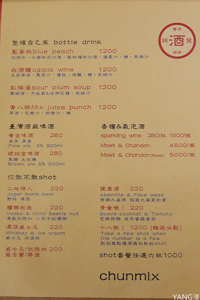 菜單只有四頁,既然是餐酒館,兩頁是餐點,另兩頁當然就是酒啦。有像熱炒店整瓶整罐的,也有餐酒館或酒吧小杯的調酒,其中有一整頁是台灣風味調酒,例如芋頭西米露、辣台妹、冬瓜很威,感覺都滿有趣,有興趣的朋友都可以試試。【飲酒過量有害健康,開車不喝酒,喝酒不開車】