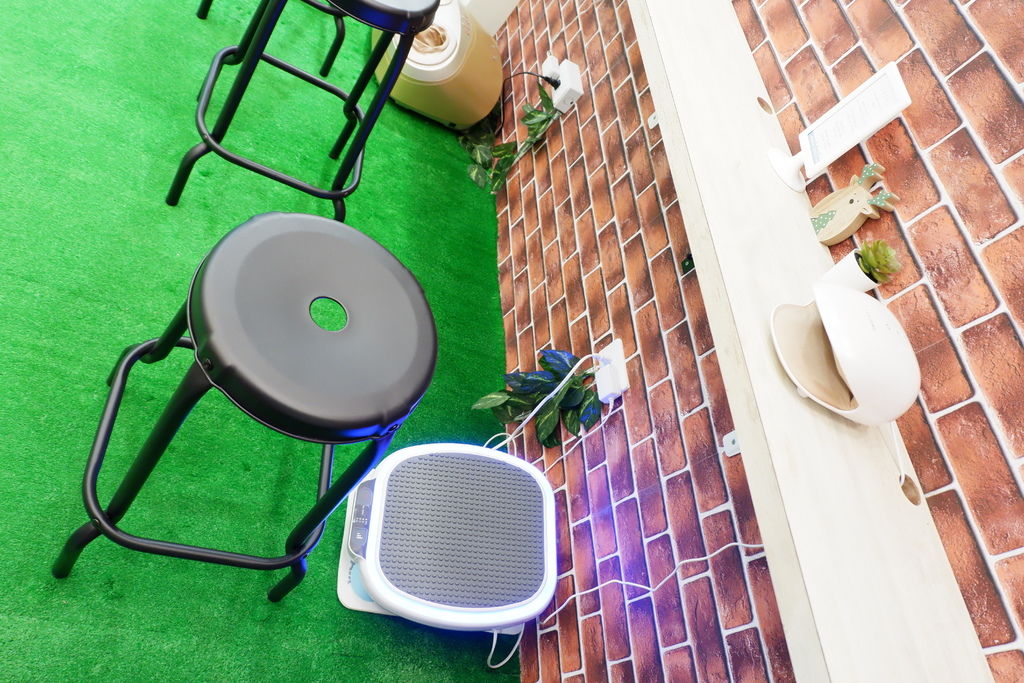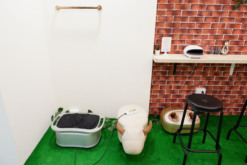 為了衛生安全需要脫鞋入內並套上藍色腳套,使用這些桌上的按摩產品須先用酒精消毒過雙手喔!