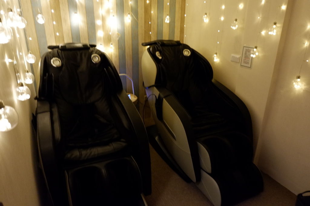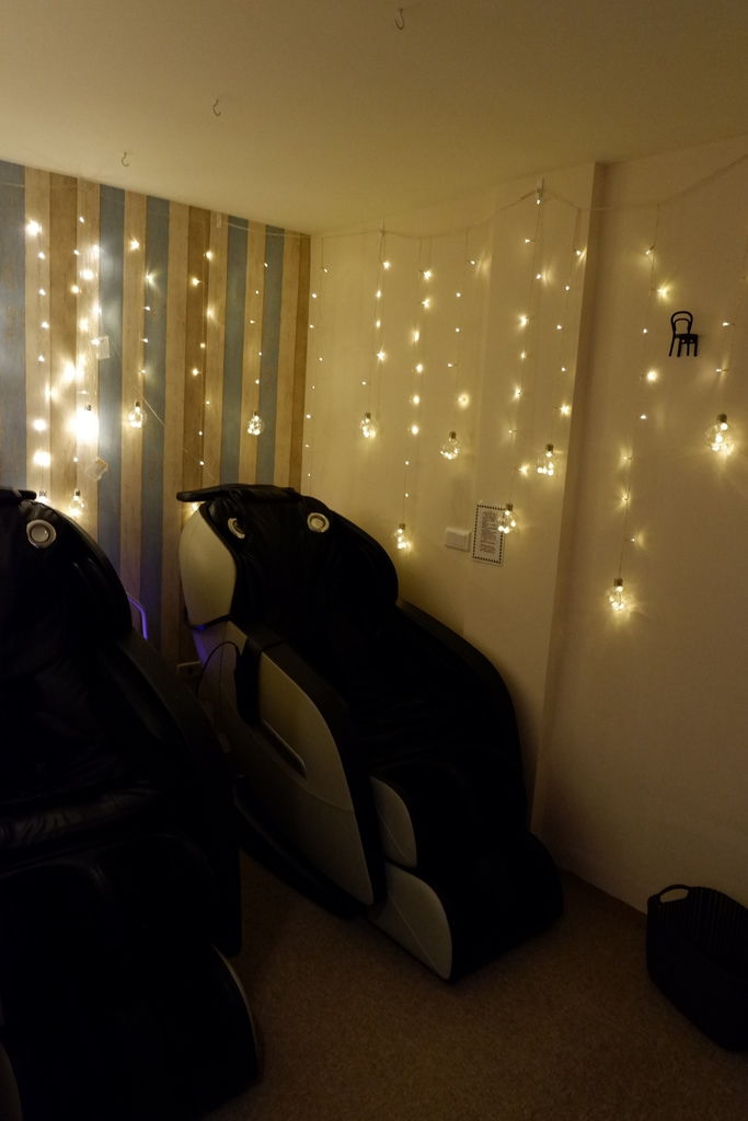 所以,一間有著加強過隔音、燈光舒適、搭配著純天然的芳香精油、助眠音樂,的舒適包廂就這樣誕生了。