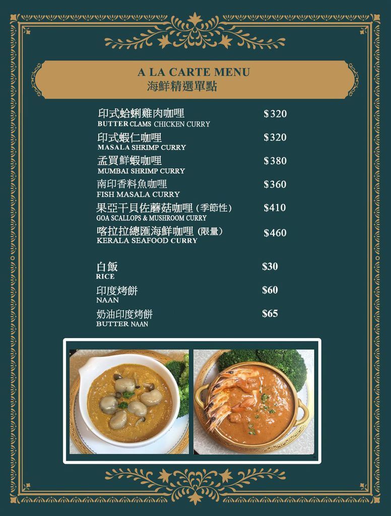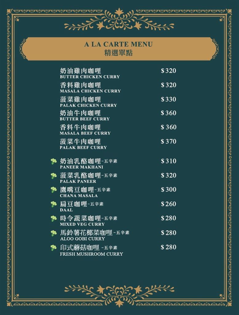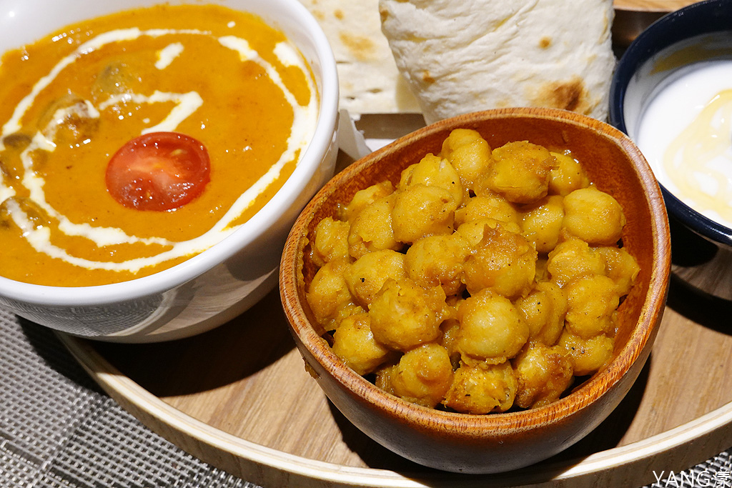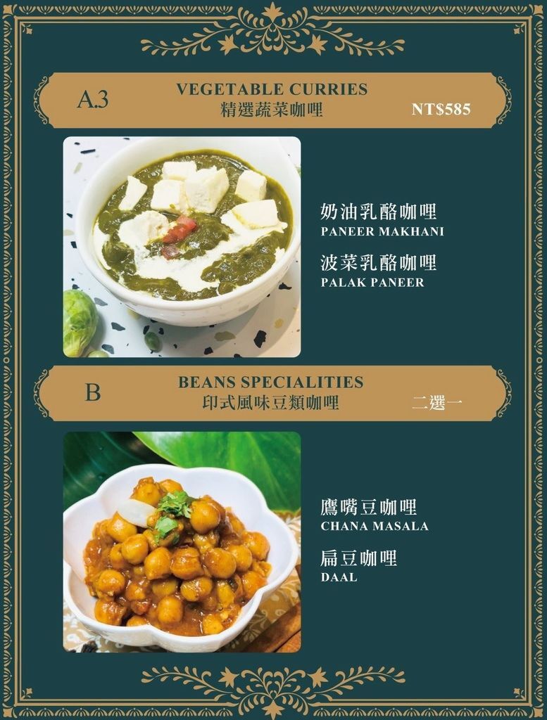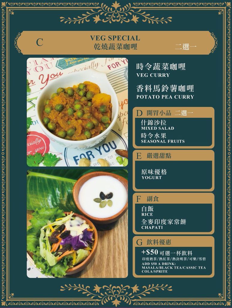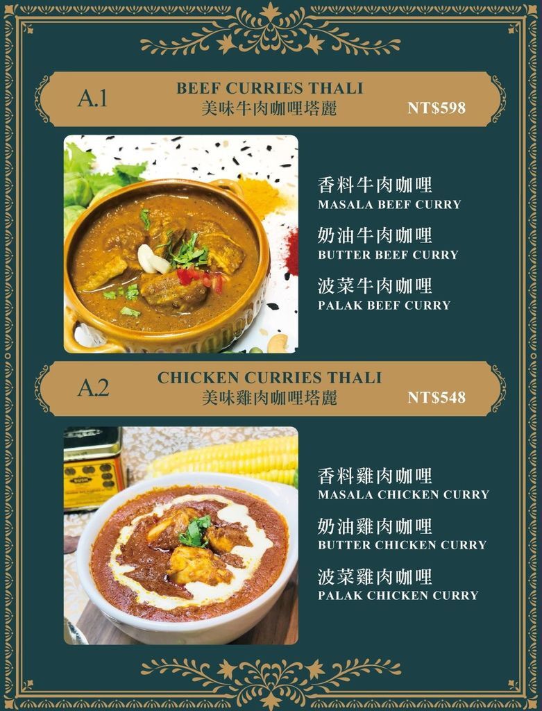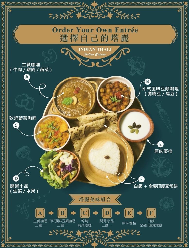 店裡主要可分為單點類和塔麗的套餐組合,因為老闆之前是作蔬食餐廳,所以餐點中有不少蔬食咖哩,預設是五辛素,可以配合需求調整成全素或奶蛋素。而所謂的塔麗(Thali),原本的意思指大圓盤,印度人在正式餐宴中會在塔麗上擺放各種用小碗盛裝的各種咖哩、蔬菜、優格等食物,後來就演變成套餐的名稱。這裡的塔麗雖說是單人套餐,裡頭包含主餐咖哩、豆類咖哩、乾燒蔬菜咖哩、生菜沙拉或水果、原味優格、白飯以及印度家常餅(印度烤餅),份量其實很多,如果是兩人以上用餐,可以點一組塔麗來分食。另外,點塔麗再加$50,可以加點一杯飲料。