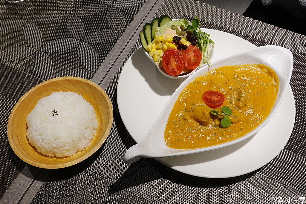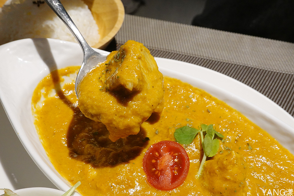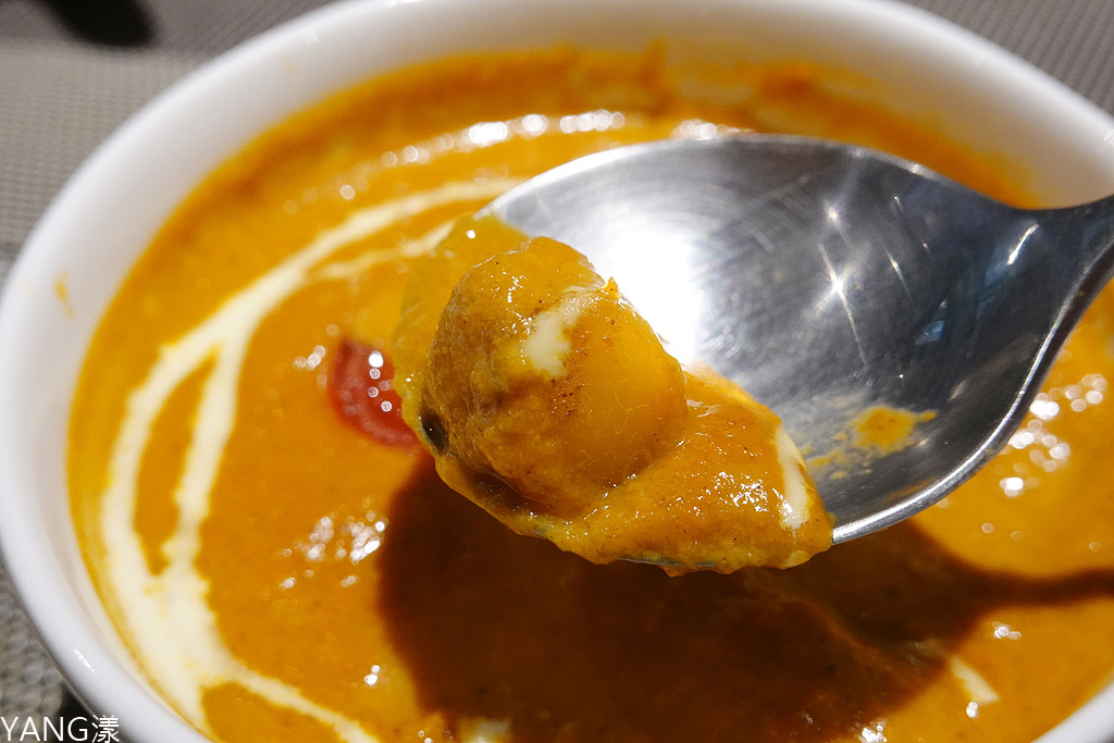 主菜的果亞干貝佐蘑菇咖哩,使用的不是生鮮大干貝,和菜單照片有點落差。雖然不像日本咖哩使用澱粉去帶出濃稠感,但使用蔬果泥也有不錯效果。這裡的咖哩有多種風味,會根據主菜的食材做變化。像這款屬於海鮮類的咖哩,就會帶一點椰奶的味道,且口味上略帶有點酸度。
