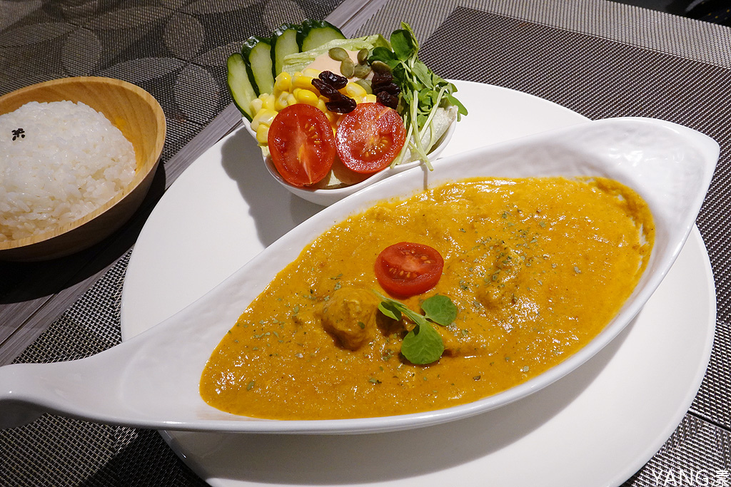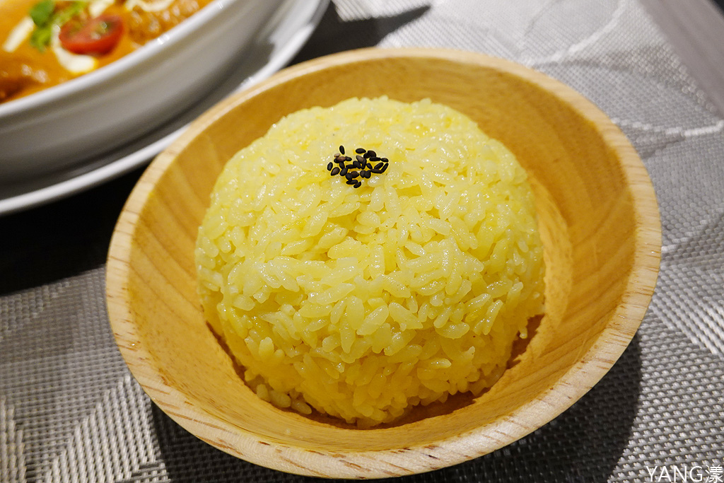 奶油牛肉咖哩和我想像的不同,奶油並非是主角,而是利用奶油襯托出咖哩香料的風味。牛肉本身有燉到軟嫩,也有融入咖哩的味道,稍比香料咖哩溫和,這道也是滿好吃。薑黃飯有淡淡的香氣但不會很明顯,白飯或薑黃飯都很好吃。