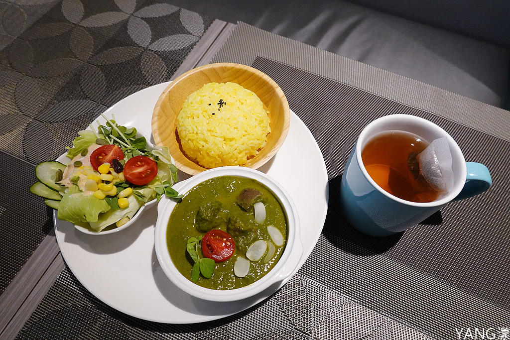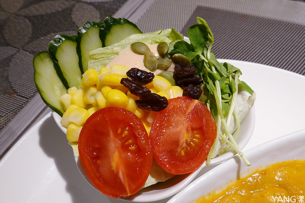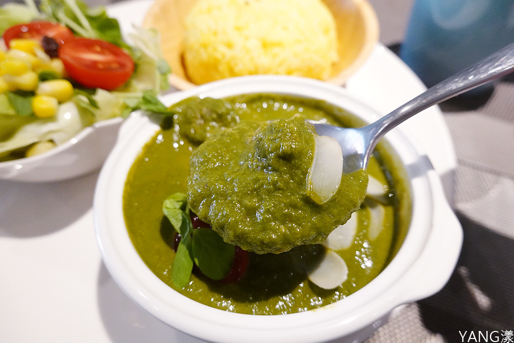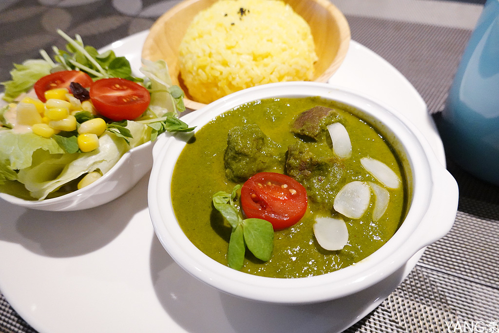平日晚上才吃得到的經濟套餐真的是很超值,只要$300內,就有咖哩、飯、生菜沙拉和一杯熱茶,這也可以算是迷你版的塔麗吧。雖然咖哩份量較小,但搭配一碗飯剛剛好。這組菠菜牛肉咖哩雖然用了大量菠菜汁,沒有菠菜渣渣,也不會有很重的菜味,而且吃起來帶有柔香滑順的口感,和前面幾種相比又是完全不同風格。