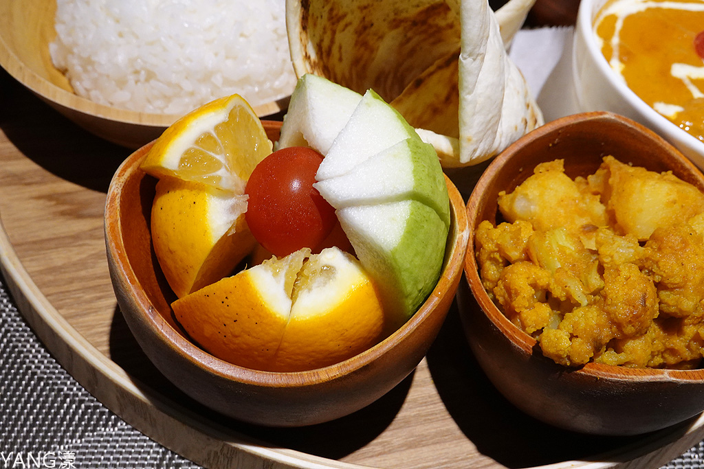 單點類只有一盤咖哩和一份水果,白飯需要另外加點,也可以點印度烤餅來搭配,有多種口味可選擇。
