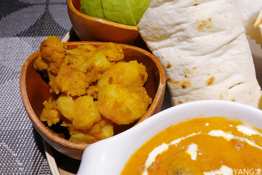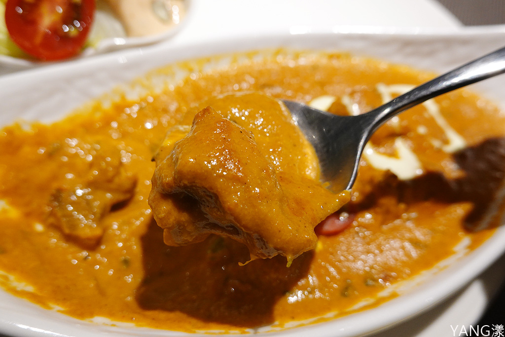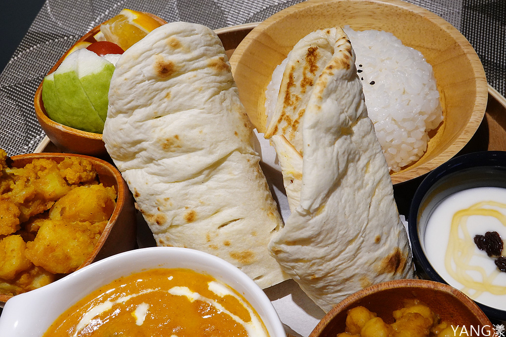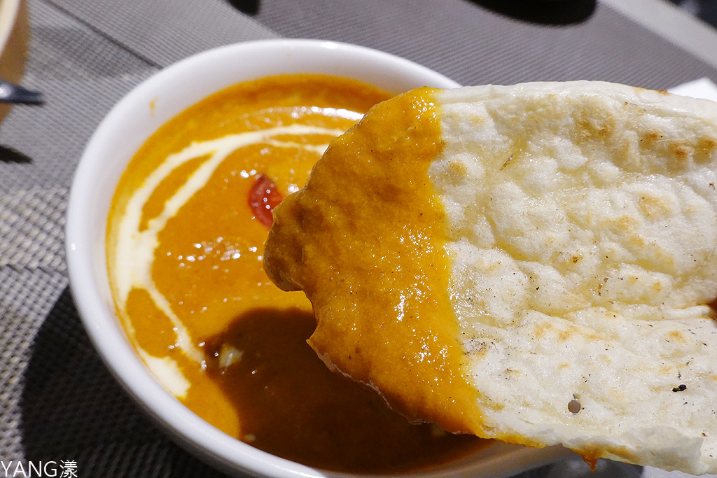 我個人大推這裡的印度烤餅,剛端上桌就香氣四溢,讓人食指大動。烤餅吃起來很Q,單吃時在咀嚼過程中可以感受到麵粉本身的氣味。蘸上咖哩吃,味道更是夢幻。