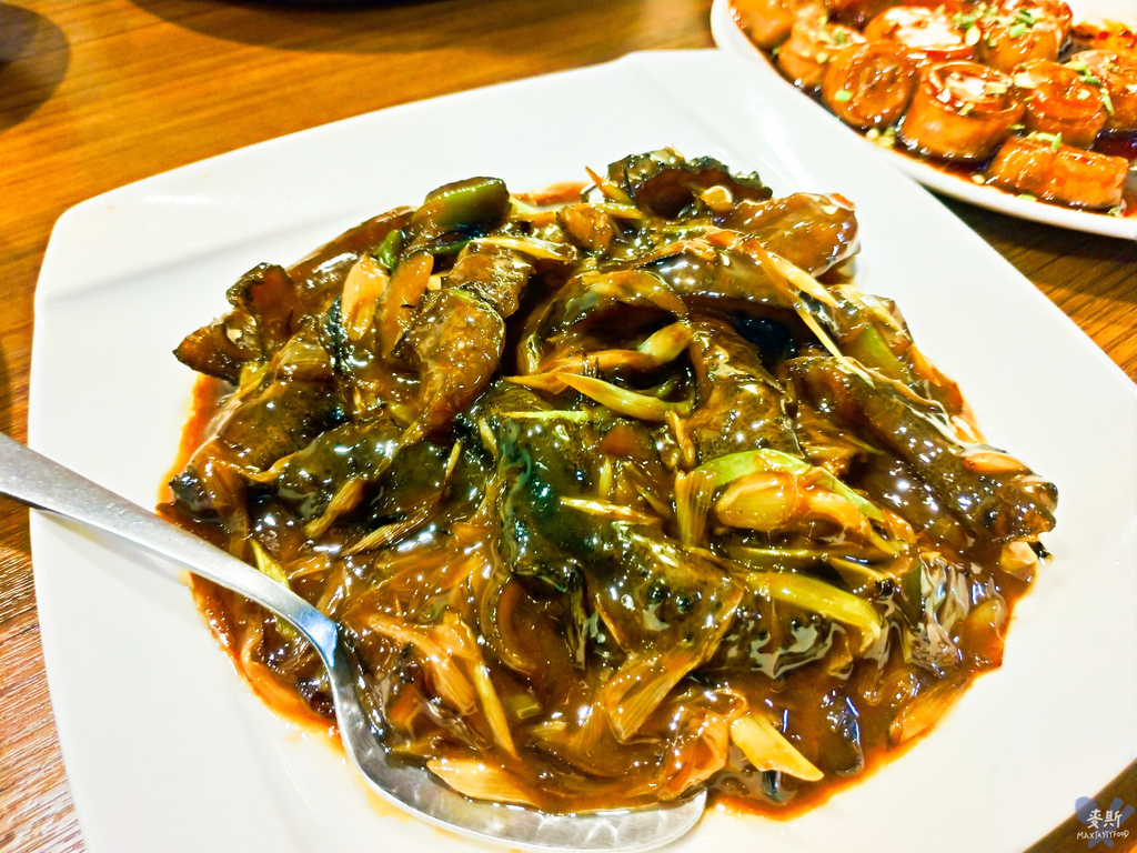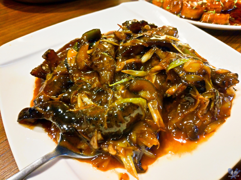 這海參 肉厚實飽滿 咬起來不止滑嫩還肉頭感十足 蔥香醬甜海參鮮 三味一體