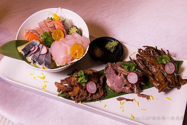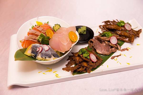 再來是獨家滷味拼盤跟生魚片海鮮拼盤,微微透光的魚肉彷彿驕傲地在宣告自己絕佳的新鮮度,擠上一點金桔再沾上芥末醬油~太好吃啦。