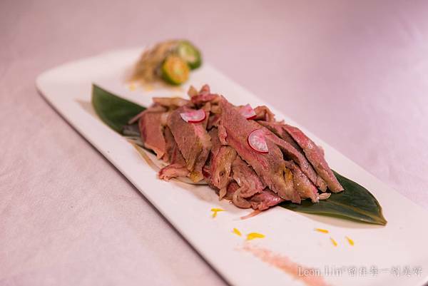 主廚首先幫我們上了開胃的小菜,滷肝蘋果。咦?豬肝加蘋果?我來我來!身為愛吃鬼看到沒吃過的特別菜色總是忍不住想嚐鮮嘛…唔!超妙的滋味啊~完全無違和!豬肝除了選用新鮮的國產豬,還用了獨家的醬汁下去滷,再把蘋果跟大蔥包在片好的豬肝裡,一口咬下豬肝那微微沾稠的口感再配上蘋果的甜脆,圍事個人完全感受不到腥味呢~